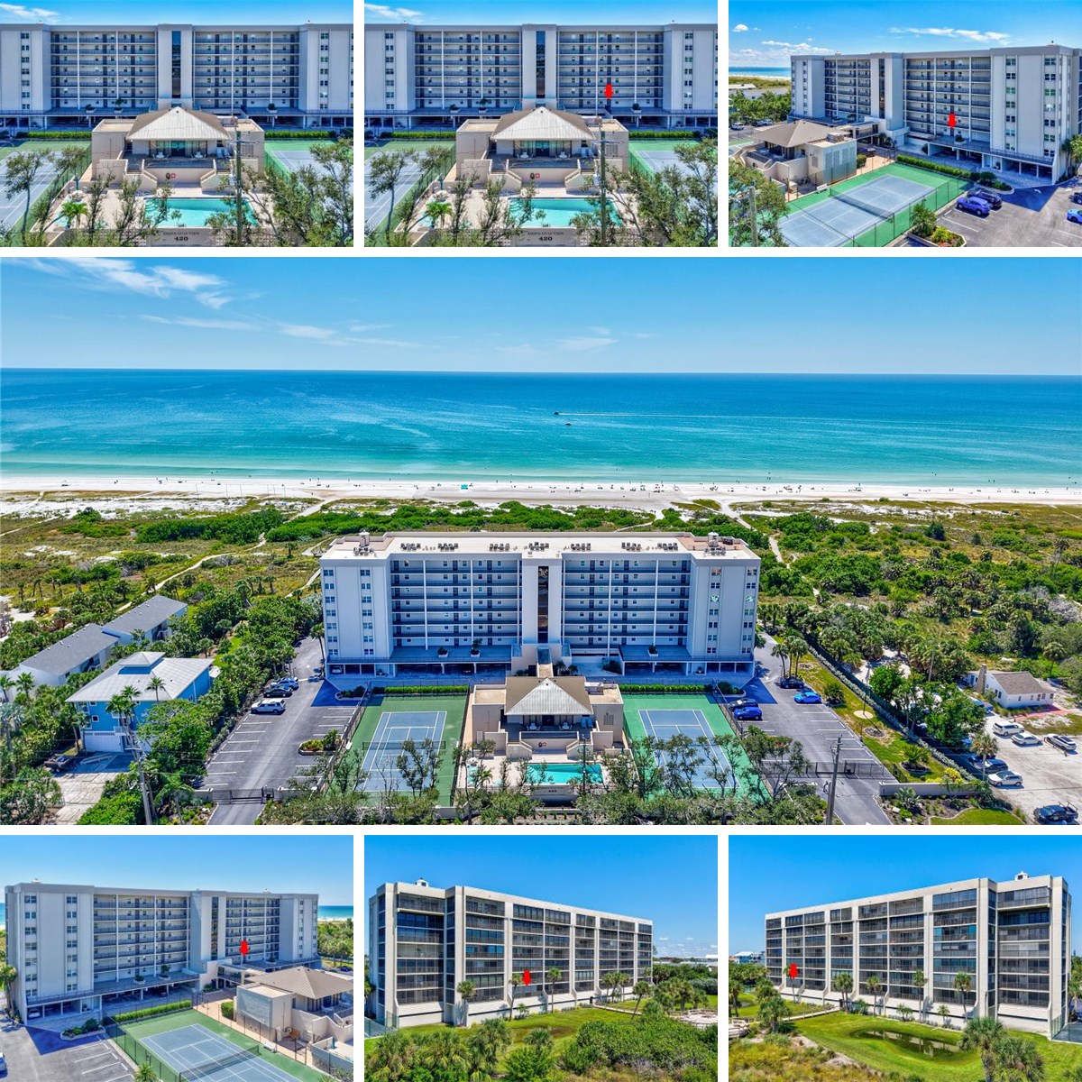 Paradise Found on Siesta Key! Wake up to Gulf breezes and end each day with a sunset over the water from this direct beachfront condo at Siesta Gulf View. This 2-bedroom, 2-bath residence offers a full west-facing panorama of Siesta Beach and the Gulf from its expansive 31-foot screened and glass-enclosed balcony, accessible from the living room, kitchen, and primary suite. From here you can enjoy both the beauty of the shoreline and the natural dune vegetation that makes this second-floor perspective feel close and connected to the beach. This floor level offers an ideal balance of easy access and elevated views: take the stairs for quick trips to the beach, pool, or parking garage, or use the elevator if preferred. No long waits, no hassle, just effortless access to every amenity. The TURNKEY FURNISHED layout includes a light-filled open kitchen with eat-in nook (perfect as a dinette or office), two spacious walk-in closets, separate laundry room, and generous storage throughout. Recent community updates give peace of mind: milestone inspections complete, all cast iron plumbing replaced in 2024, and new clubhouse roof and landscaping nearing completion, with no special assessments. Siesta Gulf View is a sought-after, gated, 59-unit community offering private boardwalk access to the quartz sands of Siesta Key Beach, plus resort-style amenities: a 25’x40’ heated pool, tennis and pickleball courts, fitness room, grilling areas, and clubhouse. Assigned under-building parking, ample guest parking, first-floor storage, and an on-site management office add convenience. Pet lovers will appreciate that up to two small pets are welcome. Best of all, you’re just blocks from vibrant Siesta Key Village: restaurants, shops, and live music are a short stroll away. Whether you’re seeking a vacation retreat, investment property (one-month minimum rentals allowed up to 12 times/year), or full-time Gulf-front living, this condo delivers the ultimate island lifestyle. Don’t miss this opportunity to claim your piece of paradise.